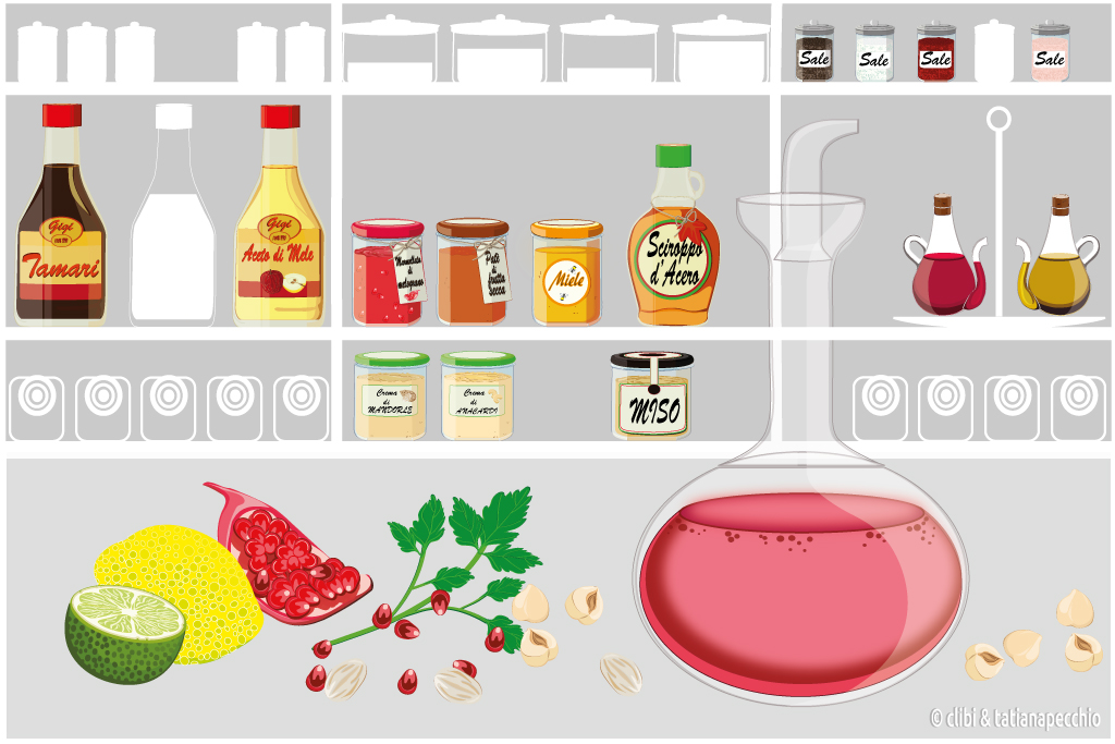 | The basic dressing is the union of three ingredients: one fat (oil), one acid (vinegar, citrus juice, pomegranate juice) and one that gives salinity (salt, tamari, nama shoyu, miso).