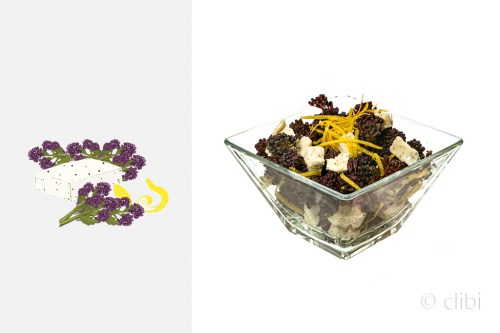 A colorful purple salad with vegan cheese with coconut.